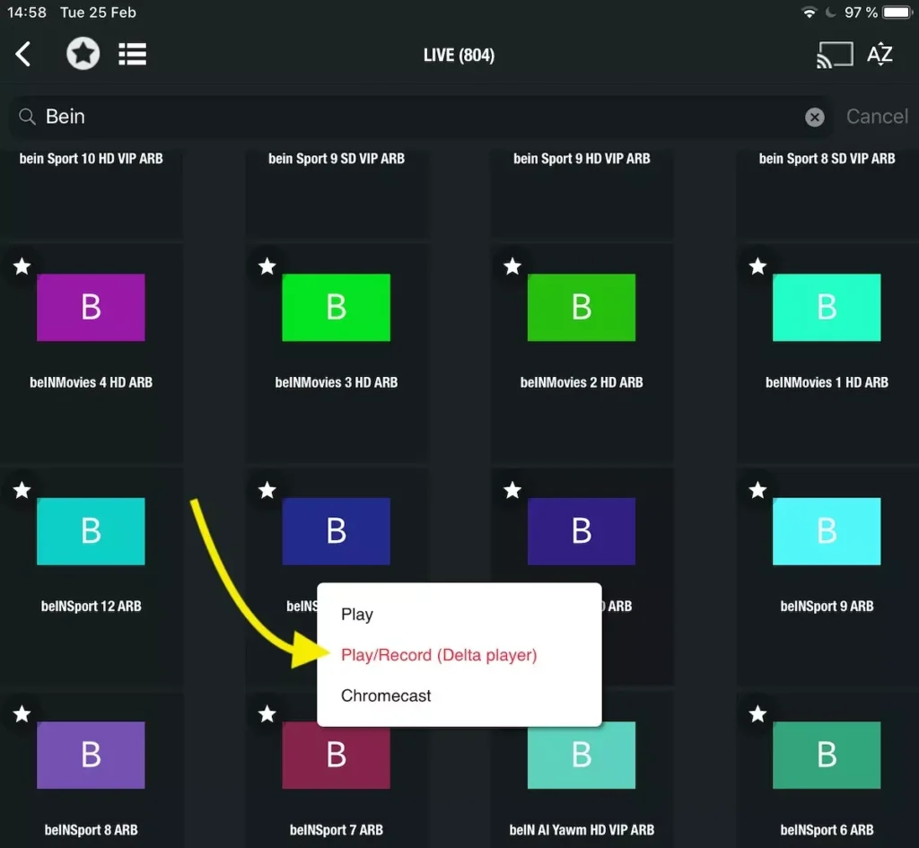 Press Cast icon on TOP-RIGHT side of app . to stream GSE smart IPTV screen over an available Chromecast device